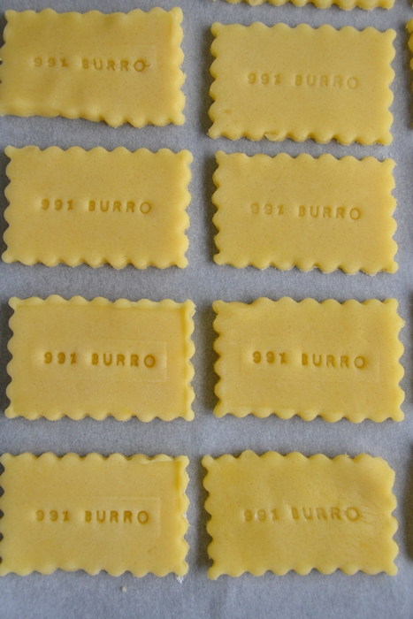 stendere su di un piano infarinato usando un mattarello e formare i biscotti con lo stampino brigitte keks, facilmente reperibile online sul sito della coltelleria collini, con il quale avrete composto la scritta desiderata (io ho optato per un ironico ma minaccioso 99% burro!)